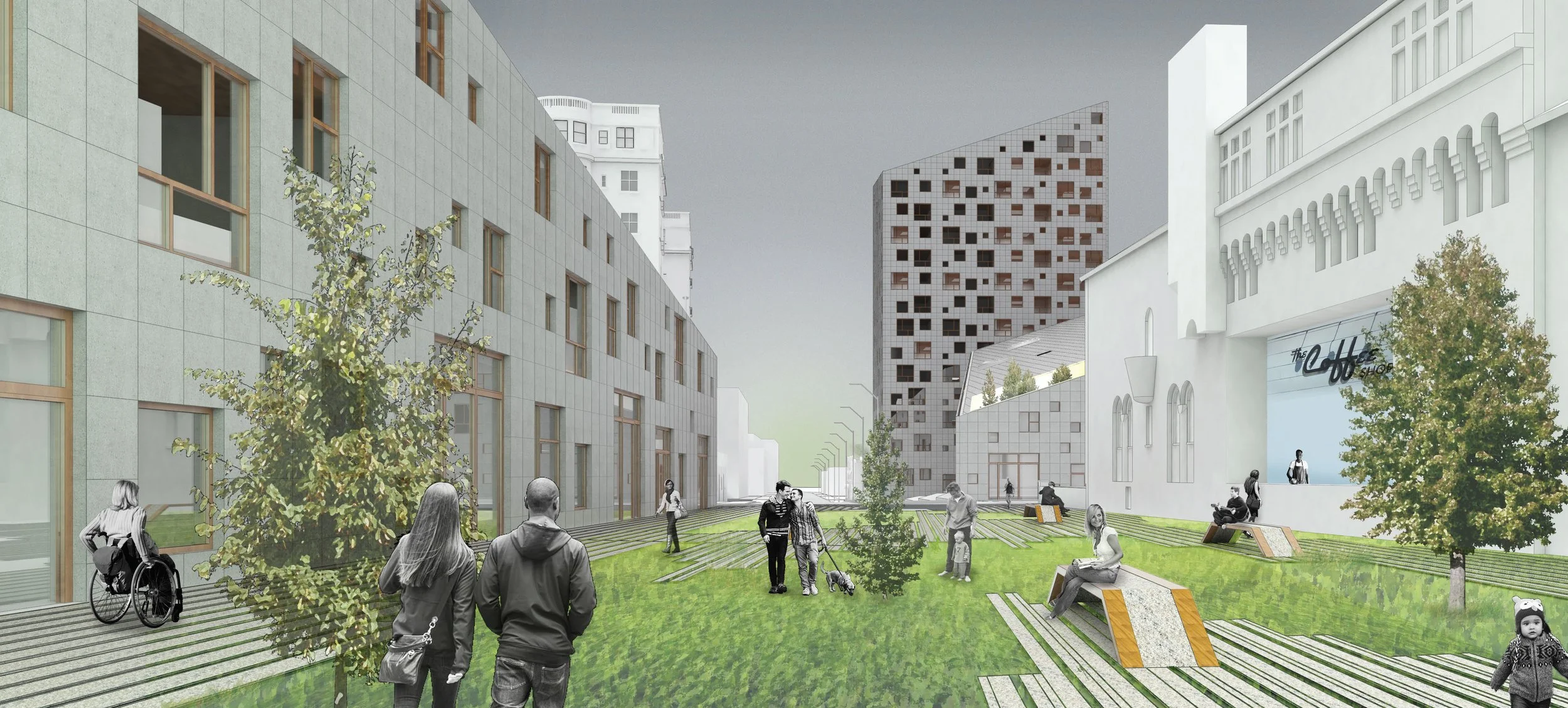 Dip Haus is a proposal for a new mid-rise mass timber housing project located on two sites at the corner of E. Jefferson Avenue and Joseph Campau in the Lafayette Park neighborhood of Detroit. The project is sited along one of the new “green fingers” put forward in SOM’s 2015 master plan for the city. The project attempts to make a site divided by a six lane street feel cohesive while acting as an anchor point for a new community in Detroit. Dip Haus was designed for a studio in collaboration with the City of Detroit planning commission, and was showcased by the City of the Detroit to developers and architects as an example of new housing models for the city in 2018. The studio and project were nominated for the Architect Journal Studio Prize.